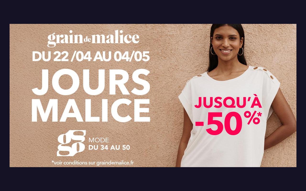 *Jours Malice : jusqu'à -50% sur les articles étiquetés en boutique du 22/04/2026 au 04/05/2026.
