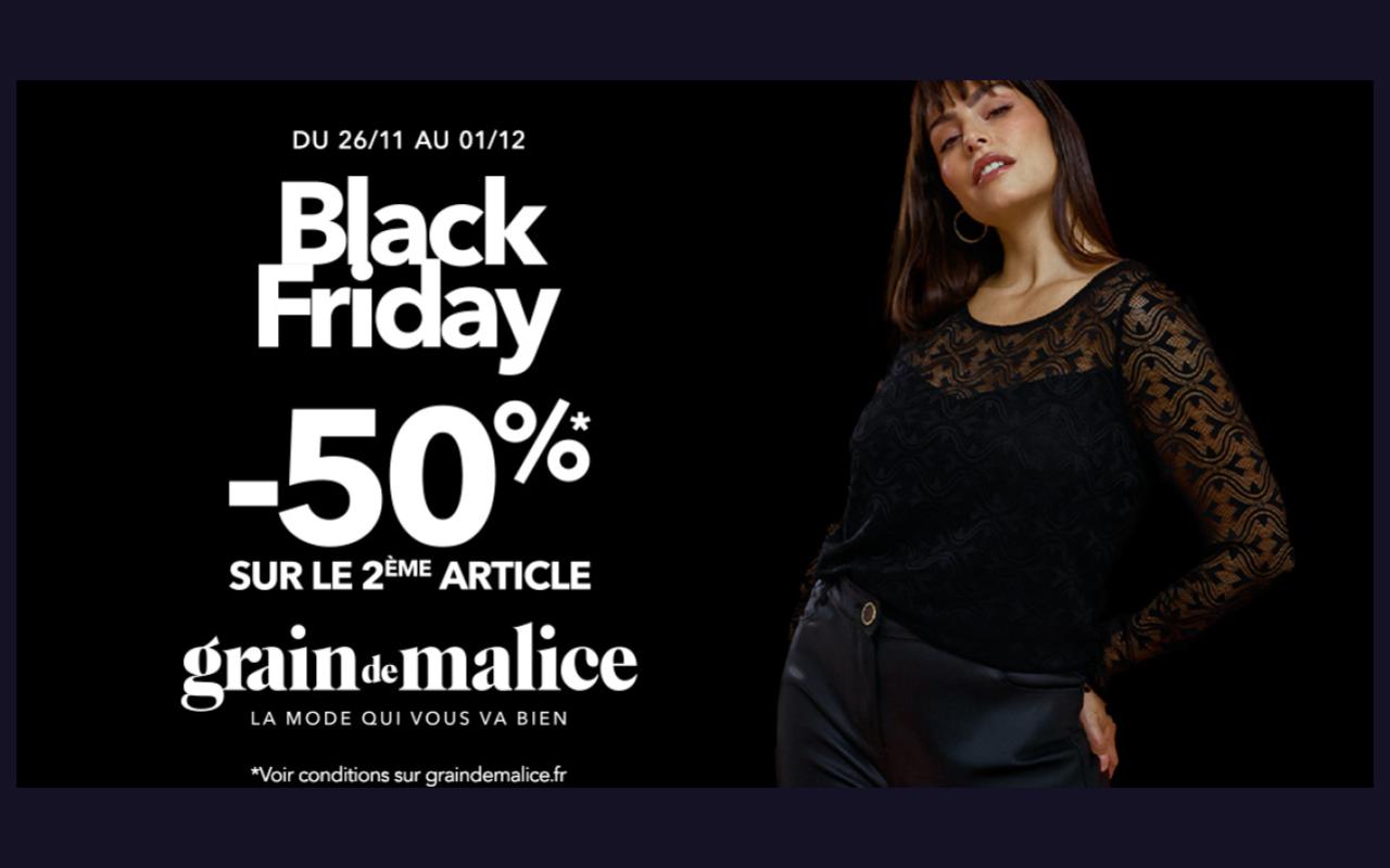 *Black Friday : -50% sur le 2ème article acheté (le moins cher des 2) du 26/11/2025 au 01/12/2025 en boutique et sur graindemalice.fr.