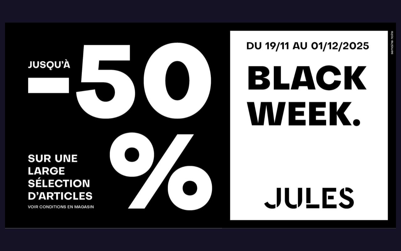 Non cumulable avec toutes autres promotions en cours (sauf les chèques fidélité du programme de fidélité JULES Le Club).