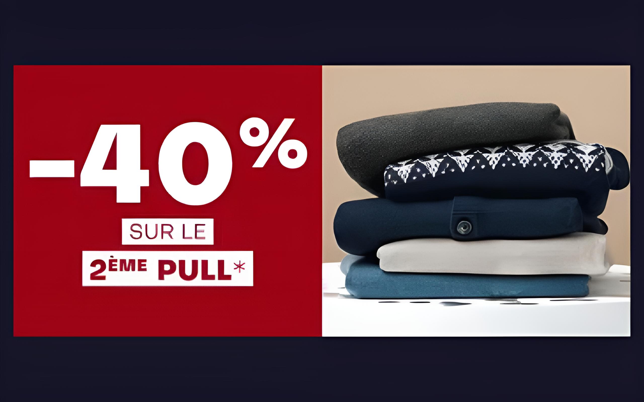 *Remise de 40% déduite en caisse sur l’article le moins cher des 2 pulls, parmi la sélection identifiée.