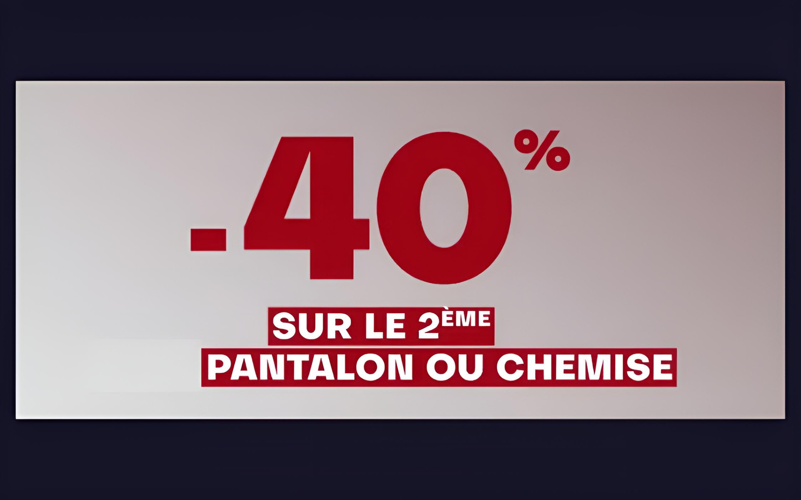 *Remise de 40% déduite en caisse sur l’article le moins cher des 2, parmi la sélection identifiée.