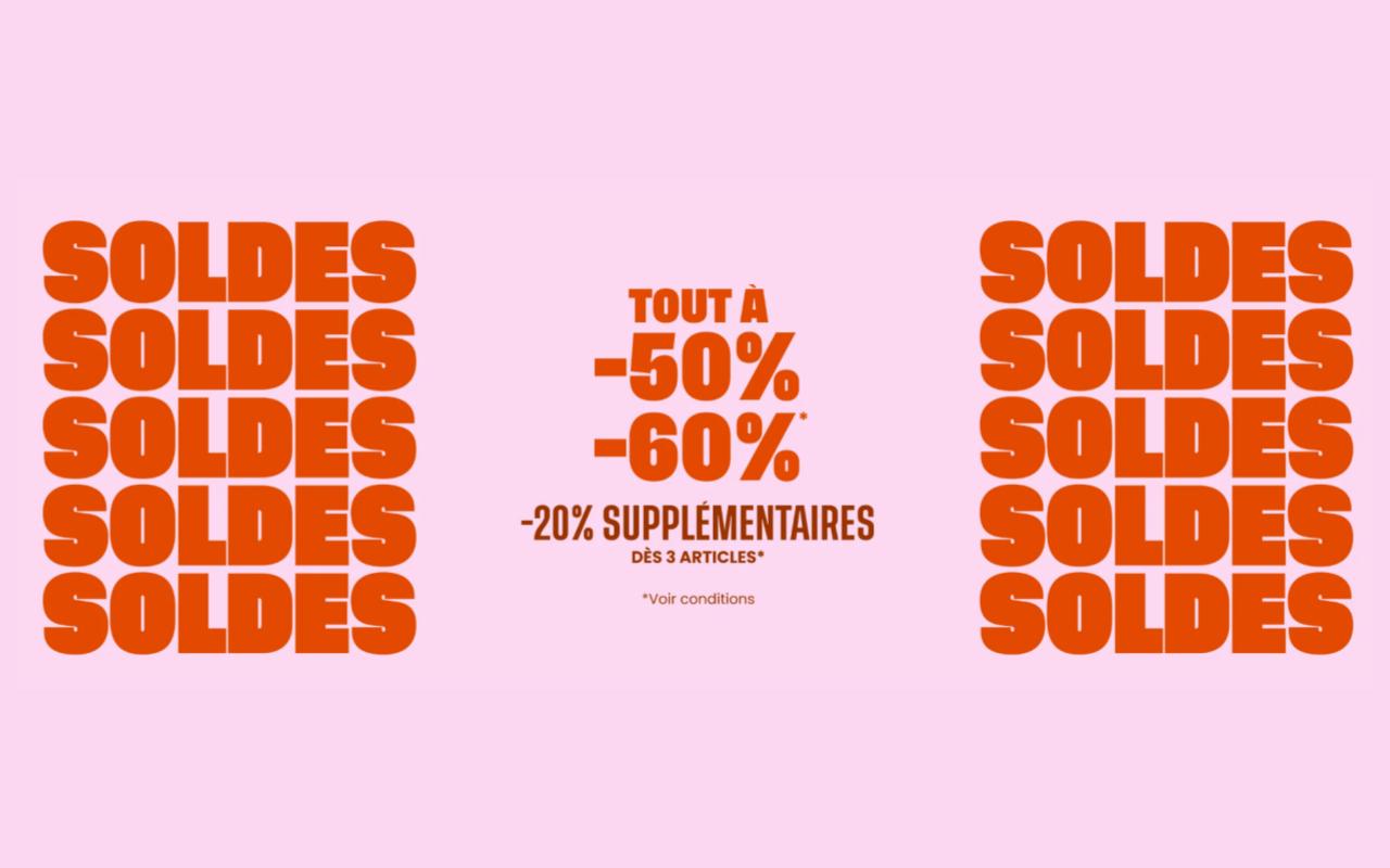 **-20% supplémentaires sur tous les produits en soldes, remise applicable uniquement à partir de 3 articles achetés parmi les produits signalés par une étiquette -50% ou -60%.